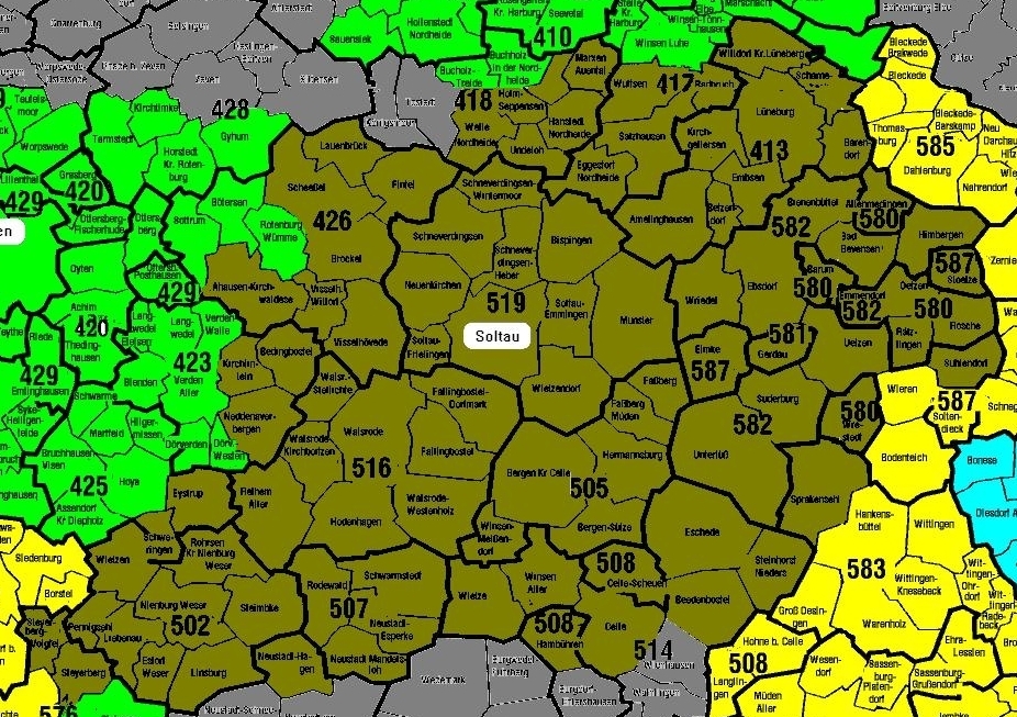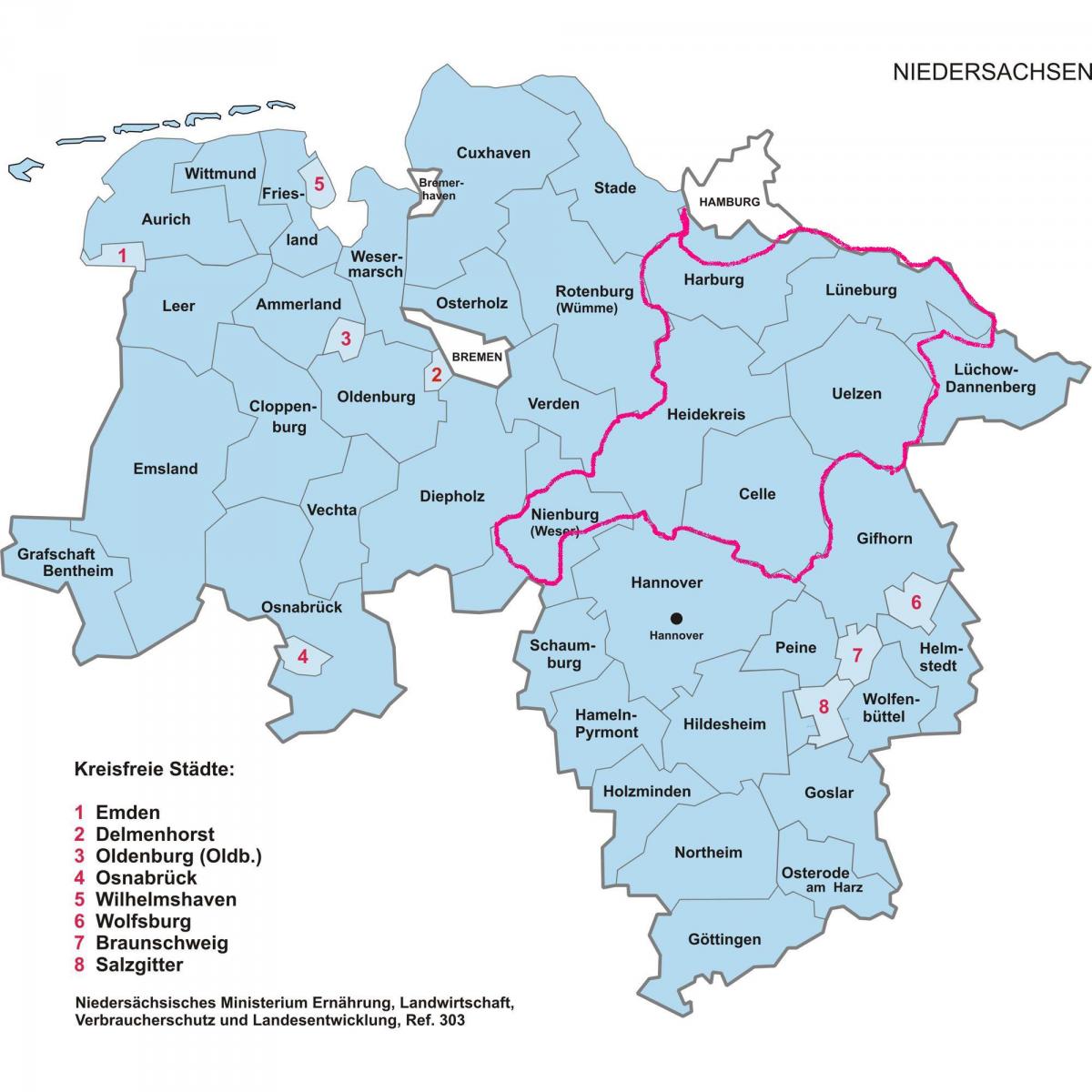 mit den Landkreisen Celle, Harburg (Winsen, Luhe), Heidekreis (Soltau-Fallingbostel), Hittfeld (Teile), Lüneburg, Nienburg (Teile) und Uelzen. Für insgesamt ca. 753.000 Einwohner (Stand 31.12.2016) in einer Fläche von ca. 7.600 qkm.